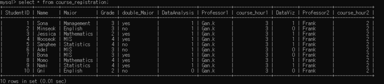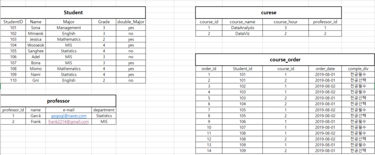 VALUES (2,'Frank','frank2214@gmail.com','Statistics'); #professor 데이터 삽입