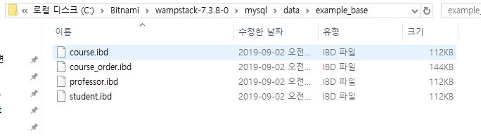 참고로 이렇게 테이블이 생성되면 데이터베이스 디렉토리안에 각각의 테이블 파일인 .ibd이 생성됩니다.