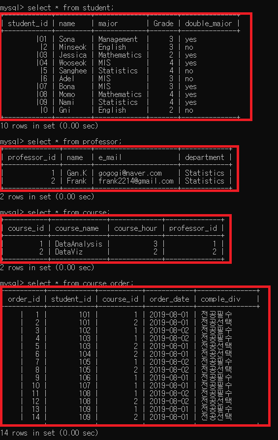 이제 그럼 4개의 테이블에 데이터들이 정확하게 다들어 갔는지 확인해보도록 할게요.