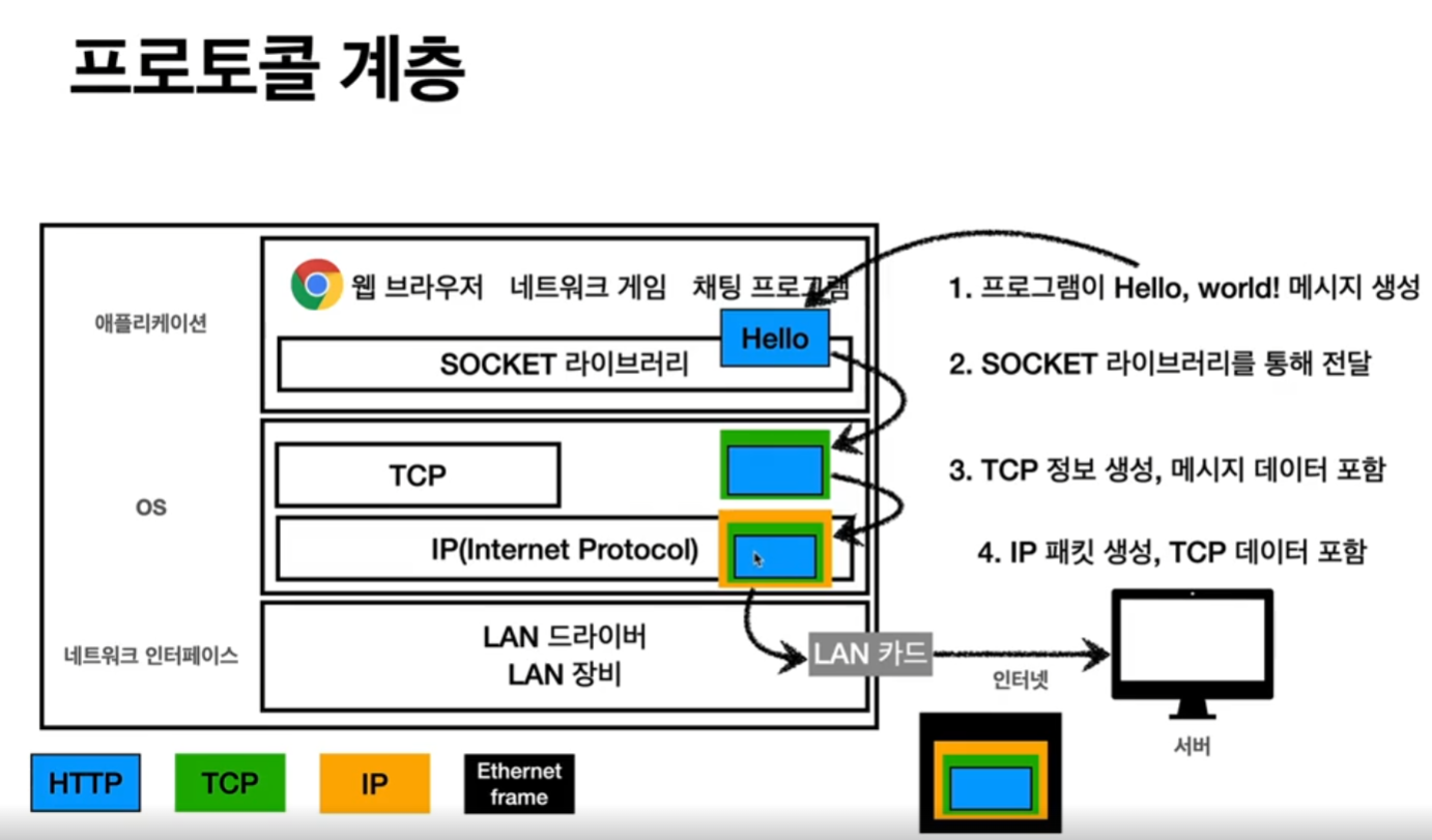 이 프로토콜 스택은 다양한 계층의 프로토콜로 구성되어 있으며, 그 중에서도 IP와 TCP가 가장 많이 쓰이고 핵심적이다.