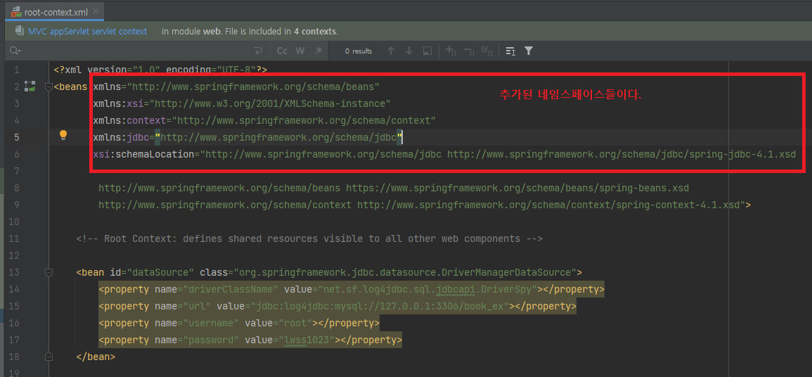 spring-jdbc모듈을 이용하여 root-context.xml에 다음과 같이 DataSource라는 것을 추가한다.