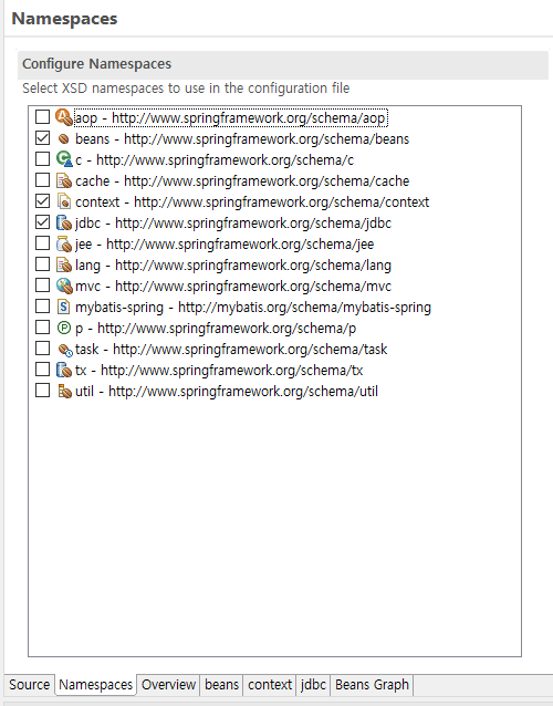 네임스페이스를 추가해주지 않으면 스프링에서 사용 가능한 XML 태그를 인식하지 못하는 문제가 발생한다.(?)