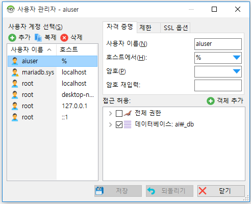 사용자 id와 PW를 설정하고 객체추가버튼을 눌러 해당 계정에서 사용할 수 있는 'DB'를 설정해줄 수 있다.