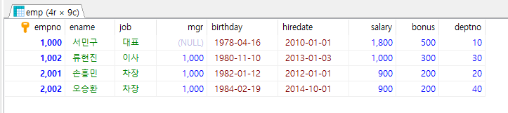 1. emp 테이블에서 사번, 이름, 부서번호와 ok, ck, 9, 9999의 리터럴값을 가지도록 sql문 작성하라