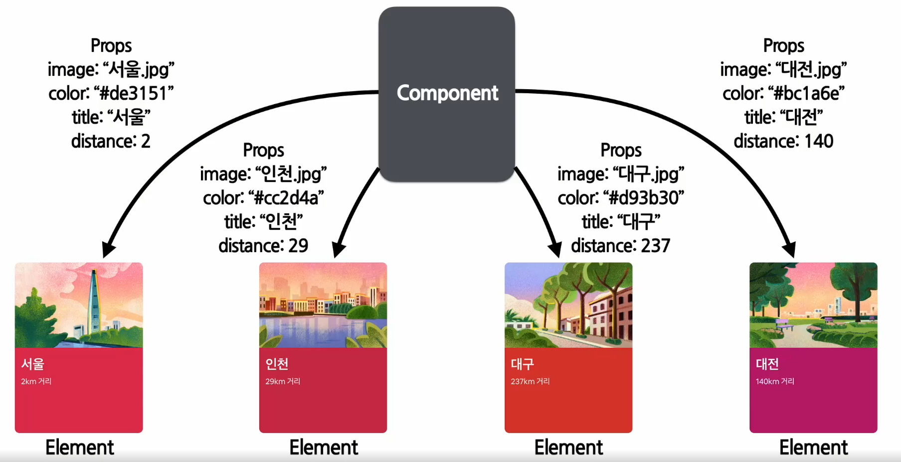 Compoent를 통해서 만들어진 Element도 props에 따라서 틀은 같지만 내용은 다른 것들이 만들어지는 것이다.
