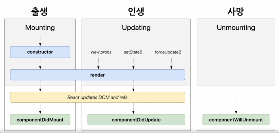 위 그림은 클래스 컴포넌트의 생명주기인데 클래스 컴포넌트가 생성된 이후로