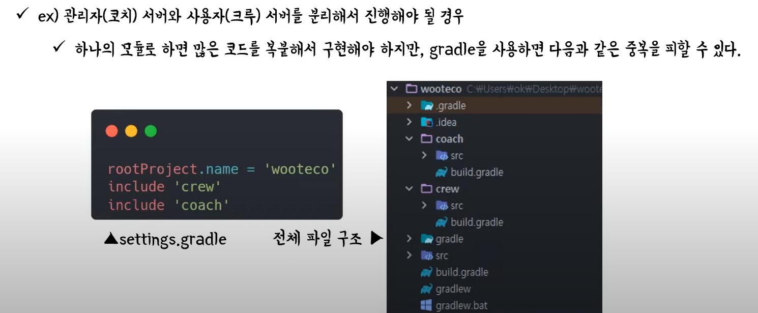하나의 모듈로 구현할 경우 겹치는 코드들을 전부 복붙해야하지만, gradle을 사용하면