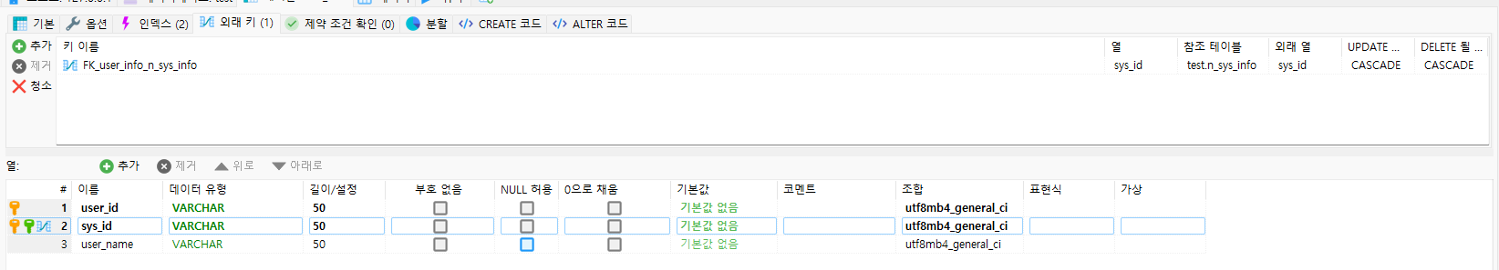 위 이미지에서 만약에 참조 테이블인 test.sys_id 의 테이블의 sys_id라는 컬럼의 조합이 utf8mb4_general_ci 가 아니거나
