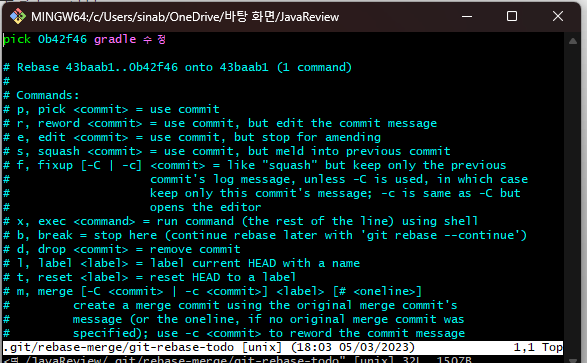 ※. -i 옵션 : rebase를 interactive 모드로 실행하겠다는 의미로서 해당 옵션을 사용하면 커밋 메시지를 수정하거나 커밋을 삭제하거나 등의 작업을 수행할 수 있다.