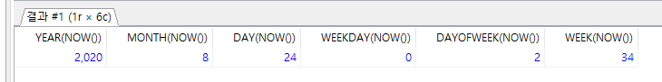 SELECT YEAR(NOW()), MONTH(NOW()), DAY(NOW()), WEEKDAY(NOW()), DAYOFWEEK(NOW()), WEEK(NOW());