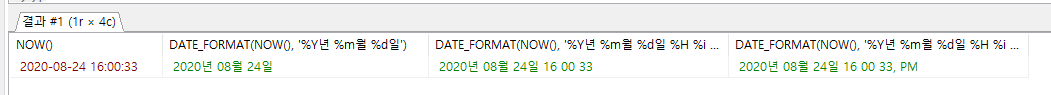 DATE_FORMAT(NOW(), '%Y년 %m월 %d일 %H %i %s'),