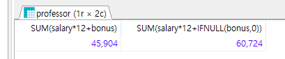 SELECT SUM(salary*12+bonus), SUM(salary*12+IFNULL(bonus,0)) FROM professor;
