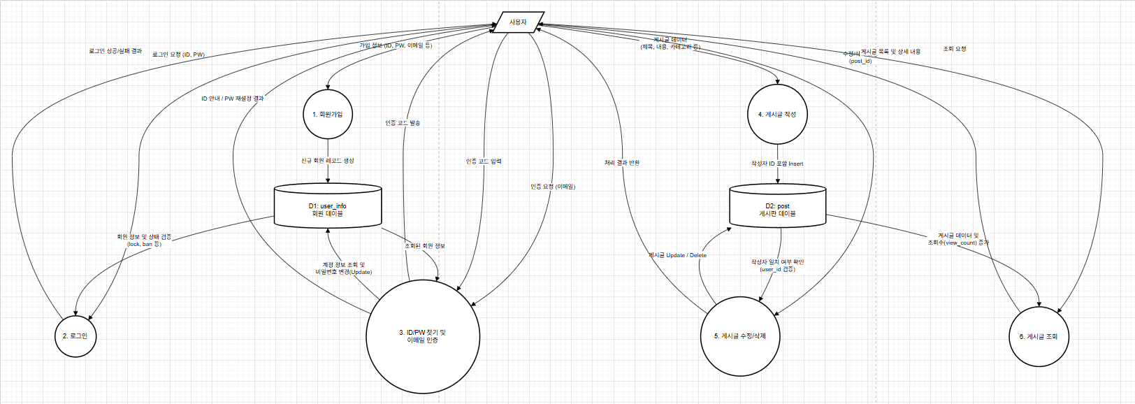위와 같은 테이블들이 존재하며, 기본적으로 로그인, 회원가입, 이메일 인증(인증코드)을 통한 아이디 및 비밀번호 찾기, 글작성하기, 수정하기, 삭제하기가 가능한 기본적인 게시판 웹사이트가 존재할 때