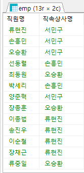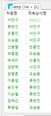 위와 같이 emp 테이블에서 ename(직원명), mgr(직속상사) 컬럼이 있는데 다음과 같은 예제를 풀어보자