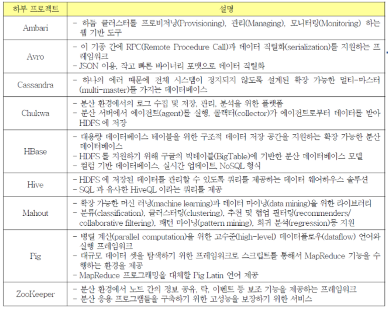 마지막으로 하둡의 서브 프로젝트들에 대한 간단한 설명이 적힌 표를 보시면 언급드리지 않았던 부분도 있지만