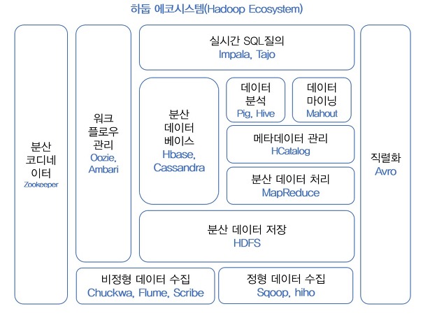 위 그림에서 보이는 것처럼 하둡은 비즈니스에 효율적으로 적용할 수 있게 하기 위해서 다양한 서브 프로젝트가 제공됩니다. 이러한 다양한 서브 프로젝트들의 모임을 '하둡 에코시스템(Hadoop-Eco System)'이라고 합니다.