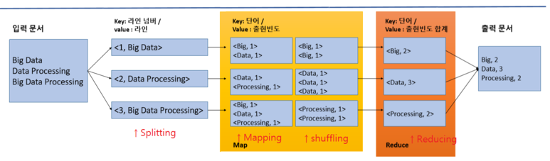 다음의 그림에서처럼 HDFS의 저장된 데이터가 입력문서처럼 있을 때 Big, Data, Processing 각 3단어가 몇개나 있는지 빈도수를 구하라는 HDFS 클라이언트의 요청이 있을때 MapReduce를 통해서 다음과 같이 분산처리됩니다.