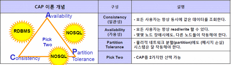 3. CAP이론 준수 : 분산형 구조는 일관성(Consistency), 가용성(Availability), 분산허용(Partitioning Tolerance)의 3가지 특징을 가지고 있고 CAP이론은 이 중 2가지만 만족할 수 있다는 이론입니다. NoSQL은 대부분이 이 CAP이론을 따르고 있습니다.