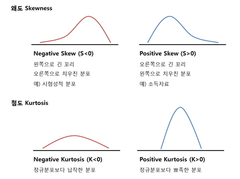 -왜도 : 자료들의 분포가 좌우로 치우친 정도를 말합니다.