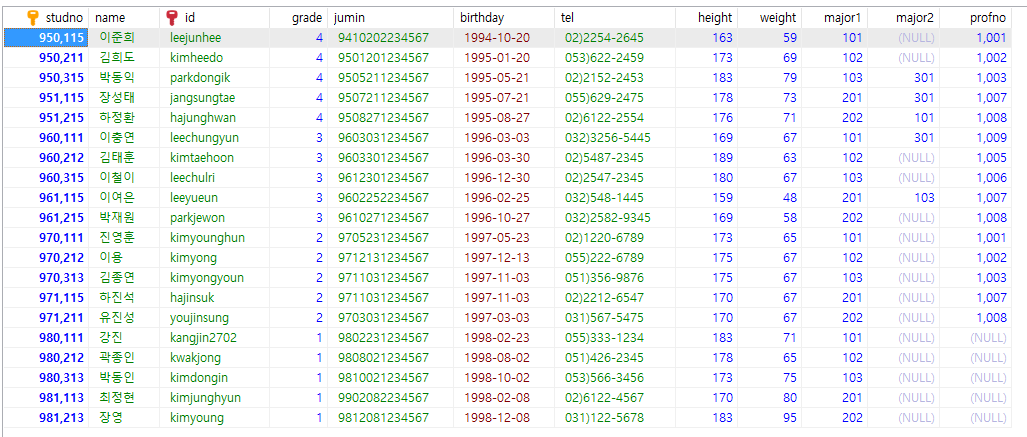 String sql = "insert into student (studno, name, id, grade, jumin, birthday, tel,"