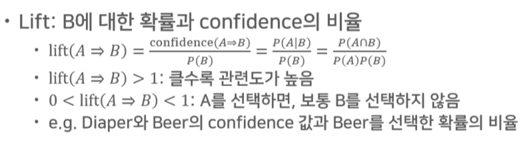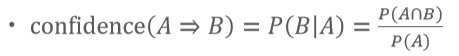신뢰도(Confidence) : A를 포함하는 경우 중, B또한 포함할 경우의 확률 (조건부확률)