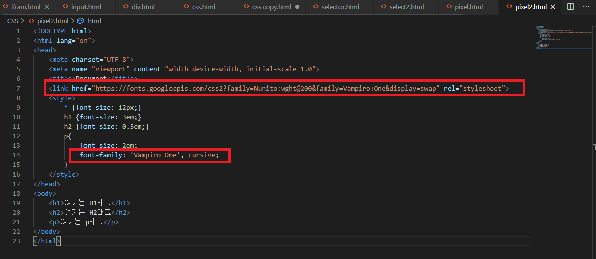 2. 선택한 폰트의 link태그나 import문을 copy한 뒤 html 내에 작성한다.