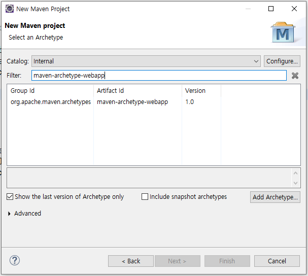 워크 디렉토리를 지정하면 다음과 같은 창이뜨는데 여기서 'maven-archetype-webapp' 을 검색하여 선택한다.