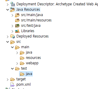 이후 생성된 프로젝트에는 아래 경로에 main폴더와 test폴더를 생성해줘야한다. (메이븐이 생성해주지 않기 때문에)