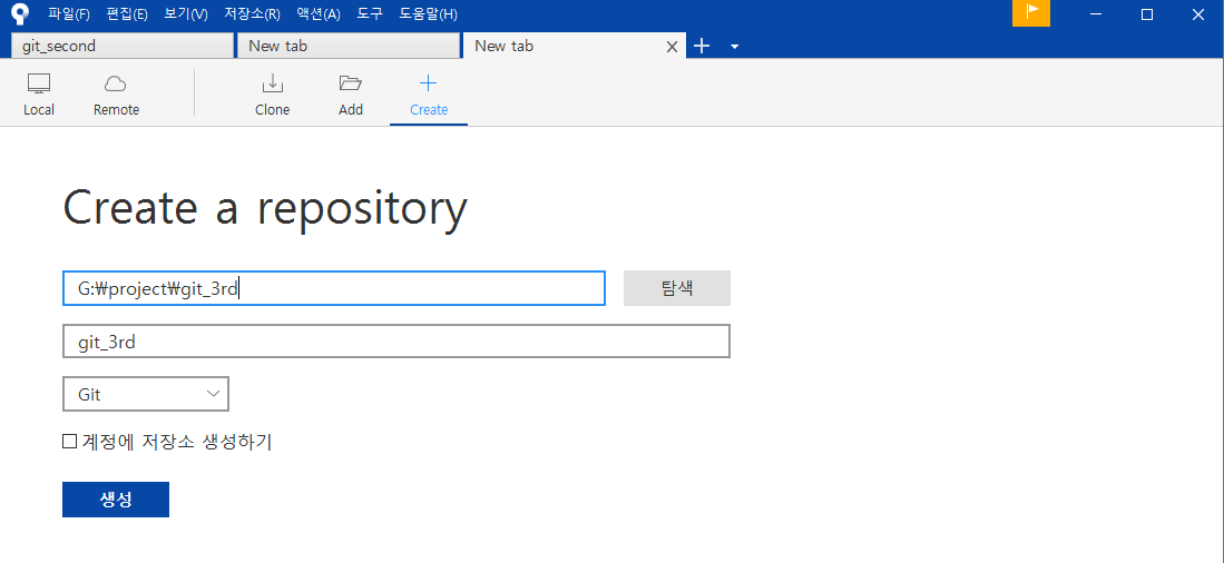 이렇게 UI 어플리케이션을 통해서도 똑같이 깃을 초기화 할 수 있는데 방법은 간단하다.