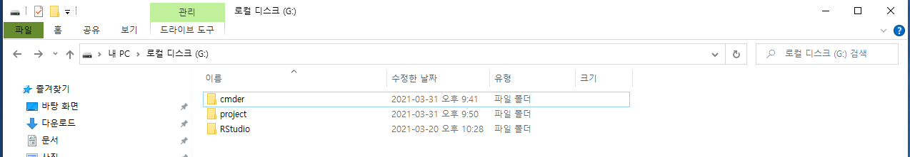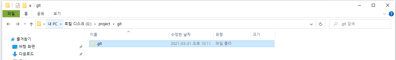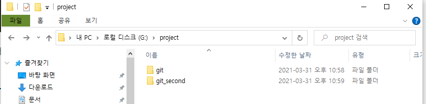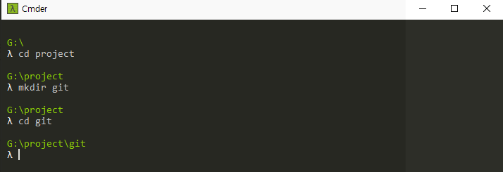 위와 같은 상태일때 G드라이브에 있는 project 디렉토리안에 git 디렉토리를 생성해서 그안으로 들어가보자
