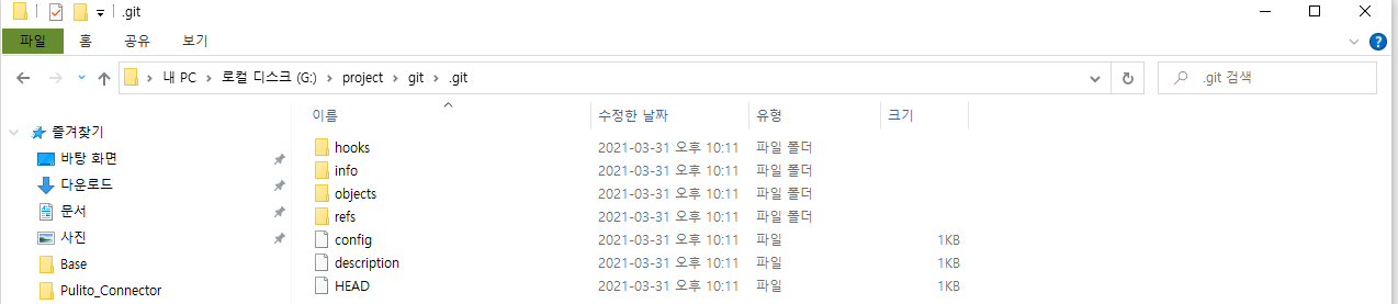 .git은 깃에 내부 구현사항인데 깃에 대한 모든 정보들이 이폴더안에 저장되어있는 것을 확인 할 수 잇다.