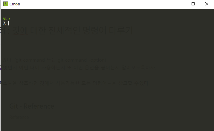 G드라이브에서git 명렁어 형식으로 이루어져 있다. (git command 또는 git command -option)
