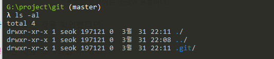 다시 ls -al 명령어를 통해서 보면 .git이라는 숨겨진 폴더가 생성된 것을 확인 할 수 있다.