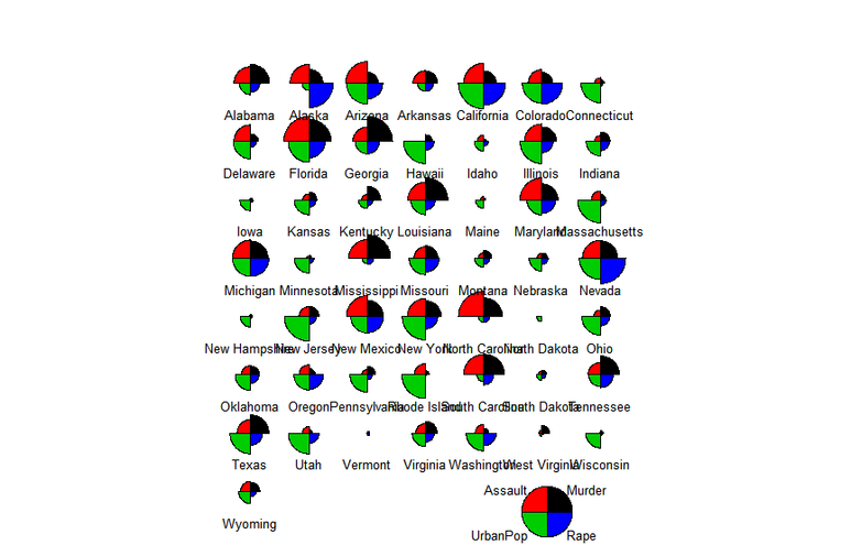 자 오른쪽 맨아래에 보시면 Assult는 빨간색, Murder는 검은색, Rape는 파란색, Urbanpop는 초록색임을 확인 할 수 있고 이를 토대로 그래프를 살펴보면 대체적으로 폭행과 살인이 범죄의 주를 이루는 도시들,