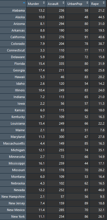우선 1975년 미국의 범죄 유형별 체포건수에 대한 데이터를 가지고 응용해보도록 하겠습니다.
