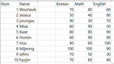 위 표는 총 10명의 학생들이 3개 과목에 대한 성적표인데요 이 데이터 셋을 가지고