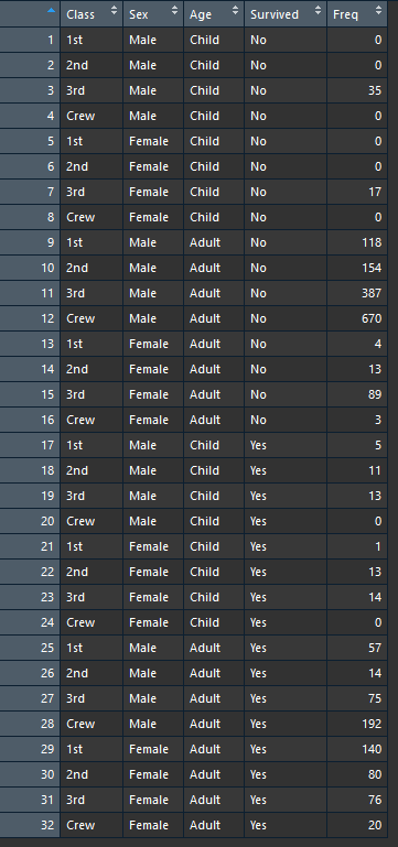 타이타닉에 생존자들에 대한 데이터인데요. class는 1등석, 2등석 등에 탑승한 사람들, Sex,age ,Survied는 생존여부 Freq는 명수입니다.