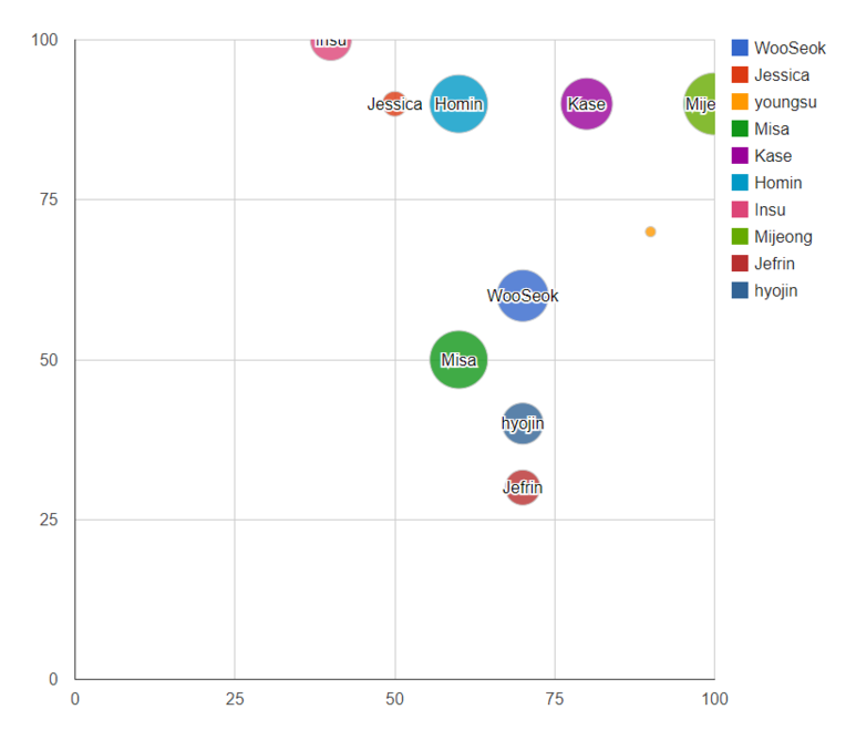 결국 위 버블차트를 통해서 보면 'Mijeong'이라는 학생이 가장 성적이 훌륭한 것을 확인할 수 있습니다.