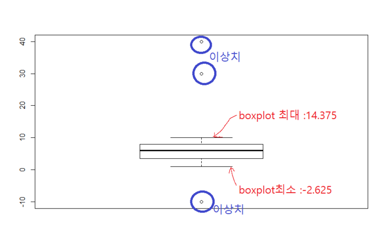 이처럼 그려지고 boxplot의 최대, 최소를 넘어가는 -10,30,30,40 들은 outlier(이상치)라고합니다.