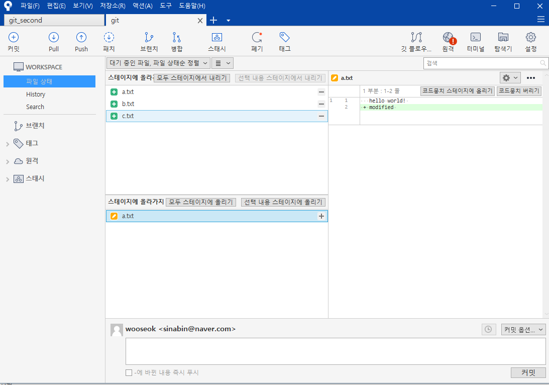 a.txt 라는 파일은 수정되어있다고 나와있다. 이를 sourcetree로 확인해본다면