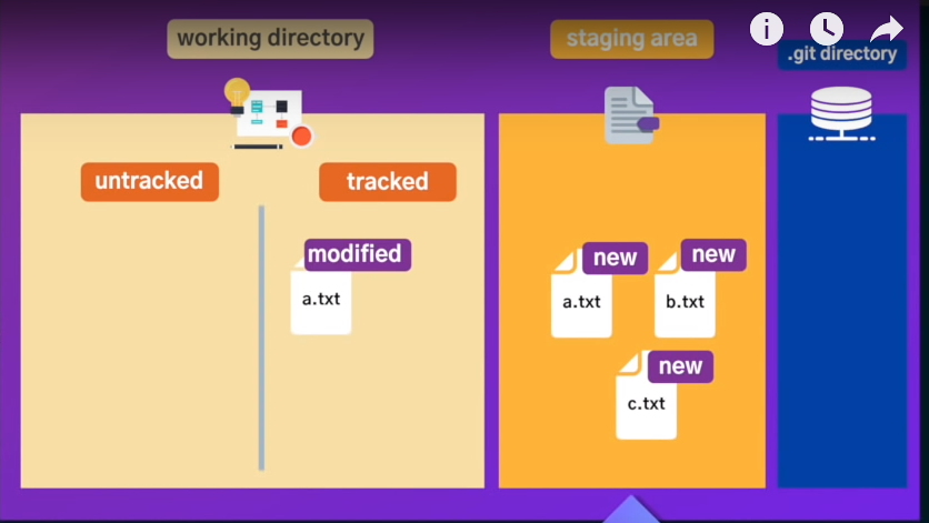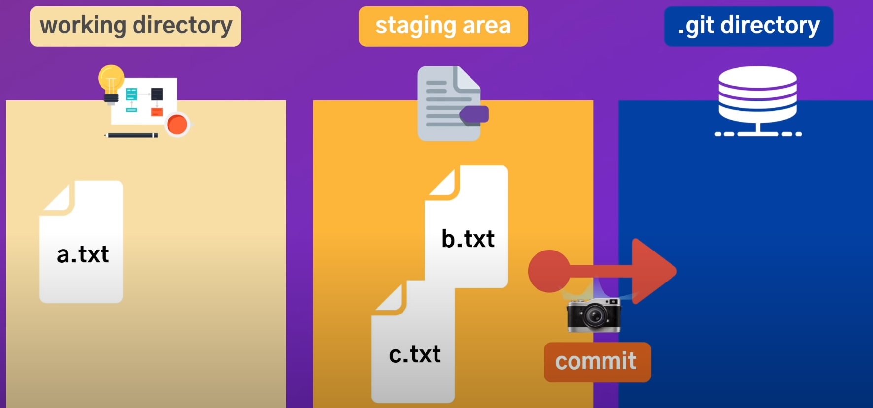 Staging area에 있는 a,b,c 파일들은 git add라는 명령어를 통해서 추가할 당시의 그 상태의 파일들이 있는걸 볼수 있고