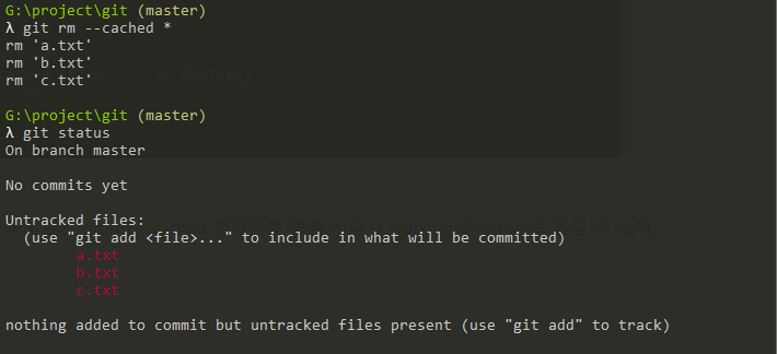 이렇게 Staging Area에 올라온 파일들은 git rm --cached 명령어를 통해서 다시 working directory로 옮길 수 있다.