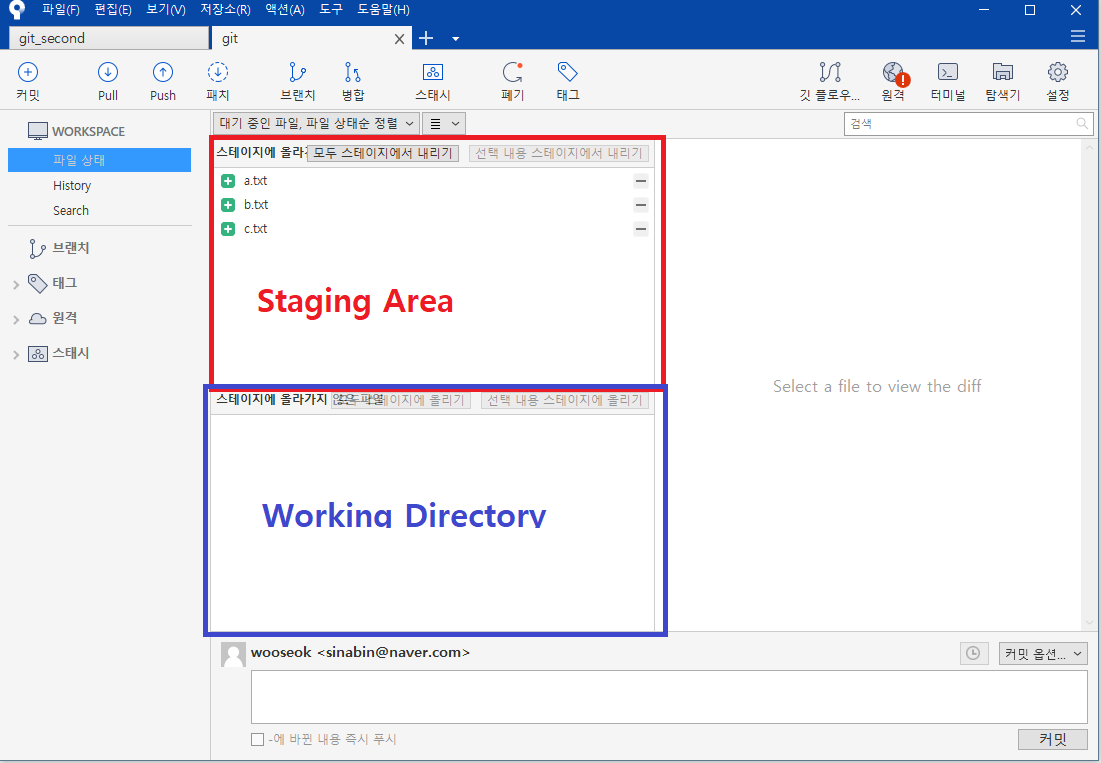 첫번째는 우리가 프로젝트의 파일들을 수정하는, 즉 작업하고 있는 working directory가 있고