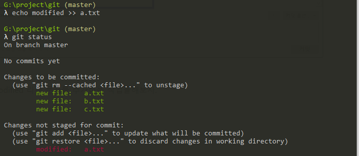 그럼 이번에는 a.txt 파일에 modified 라는 문자를 추가하는 작업을해보자.