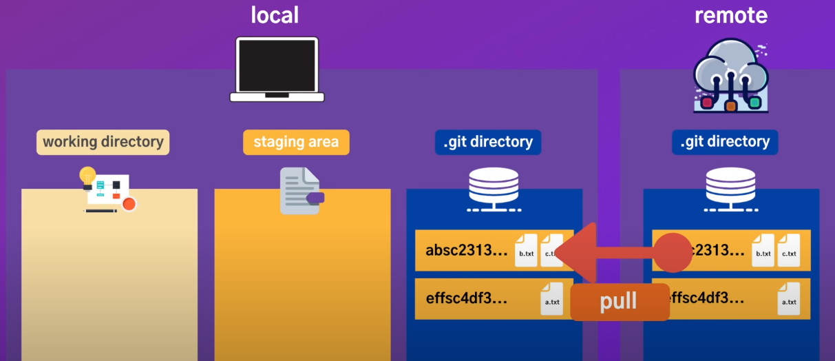 마찬가지로 서버에서 다시 로컬로 다운로드 받고 싶을 때는 pull 이라는 명령어를 통해서 받을 수 있다.