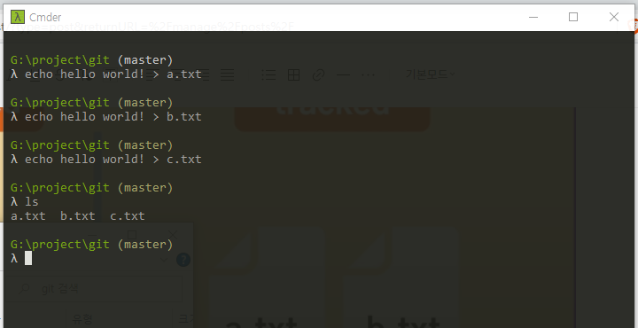 위와 같이 git 폴더에 hello world! 라는 문자가 저장된 a,b,c txt파일들을 생성한다.