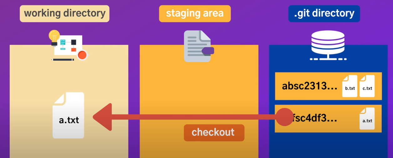 이렇게 git directory에 저장된 version 들은 check out 이라는 명령어를 통해서 언제든지 원하는 버전으로 가져올수있다.