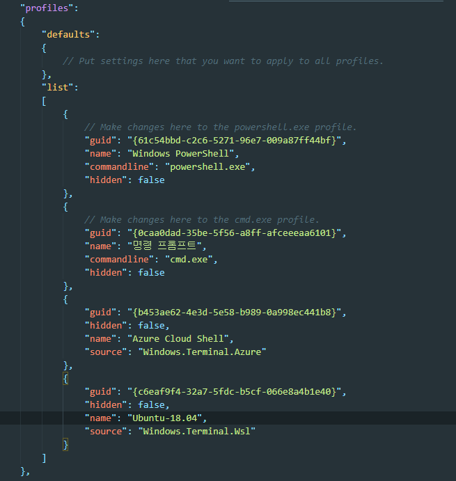 다시 설정파일을 확인해보면 아래와 같이 실행할 수 있는 터미널들 목록이 나오는데