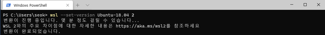 WSL의 버전을 2로 설정해주고 다음과 같이 뜨면 정상적으로 설정이 된 것이다.