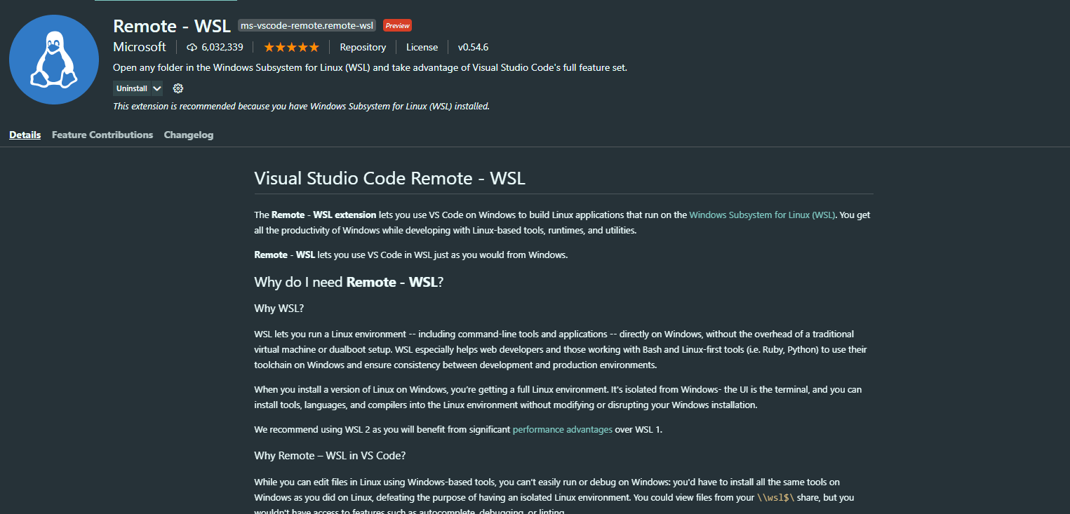설치되는 익스텐션은 Remote -WSL로써 이걸 설치해주면 리눅스 기능을 이용하여 코딩을 할 수 있게된다.